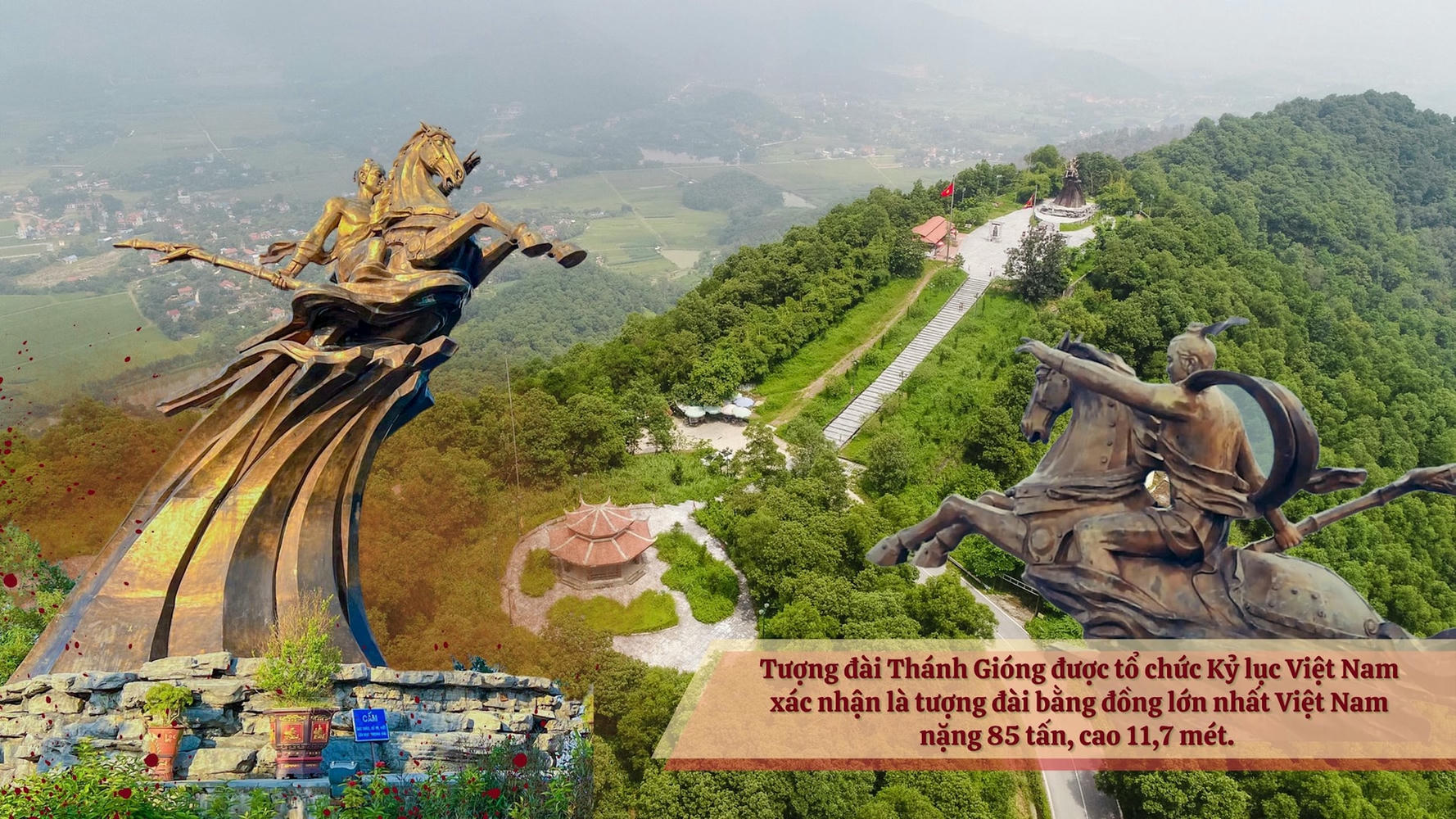 - Tượng đài Thánh Gióng: Cao khoảng 11 mét, đúc bằng đồng, đặt trên đỉnh núi Đá Chồng (núi Sóc), hướng về Thăng Long – Hà Nội, tượng trưng cho khí phách anh hùng.